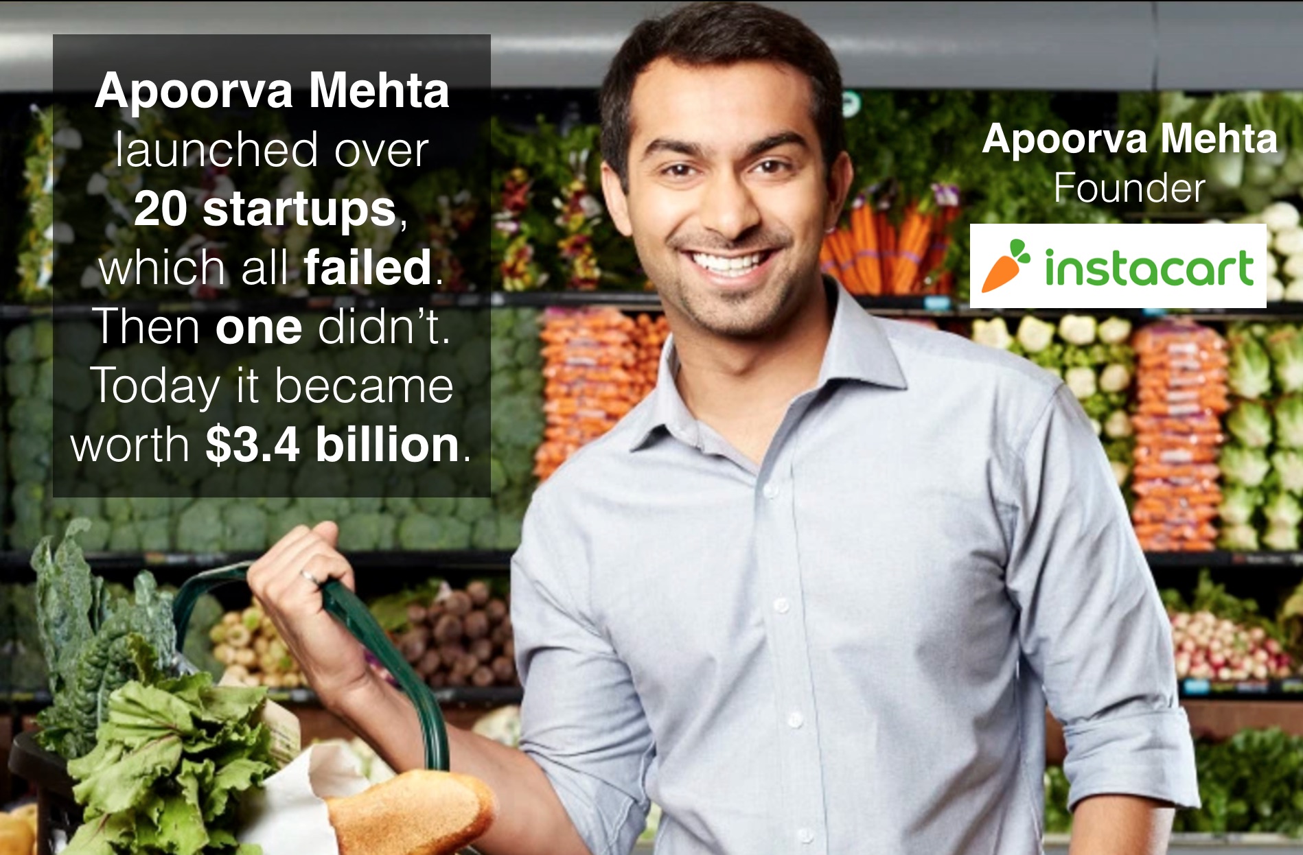 How many times are you will to fail to succeed? Apoorva Mehta endured over 20 failed startups before starting Instacart - and today, 5 years later, he has just raised $400 million, valuing Instacart at $3.4 billion.